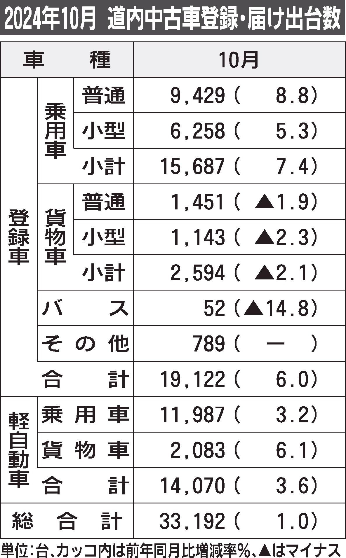 10月の道内中古車登録・届け出台数は、前年同月比1.0%増の3万3192台だった。登録車は、普通乗用車が前年同月比8.8%増と大きく伸ばした。軽自動車も前年同月より増加した。 日本自動車販売協会連合会の中古車登録台数と全国軽自動車協会連合...