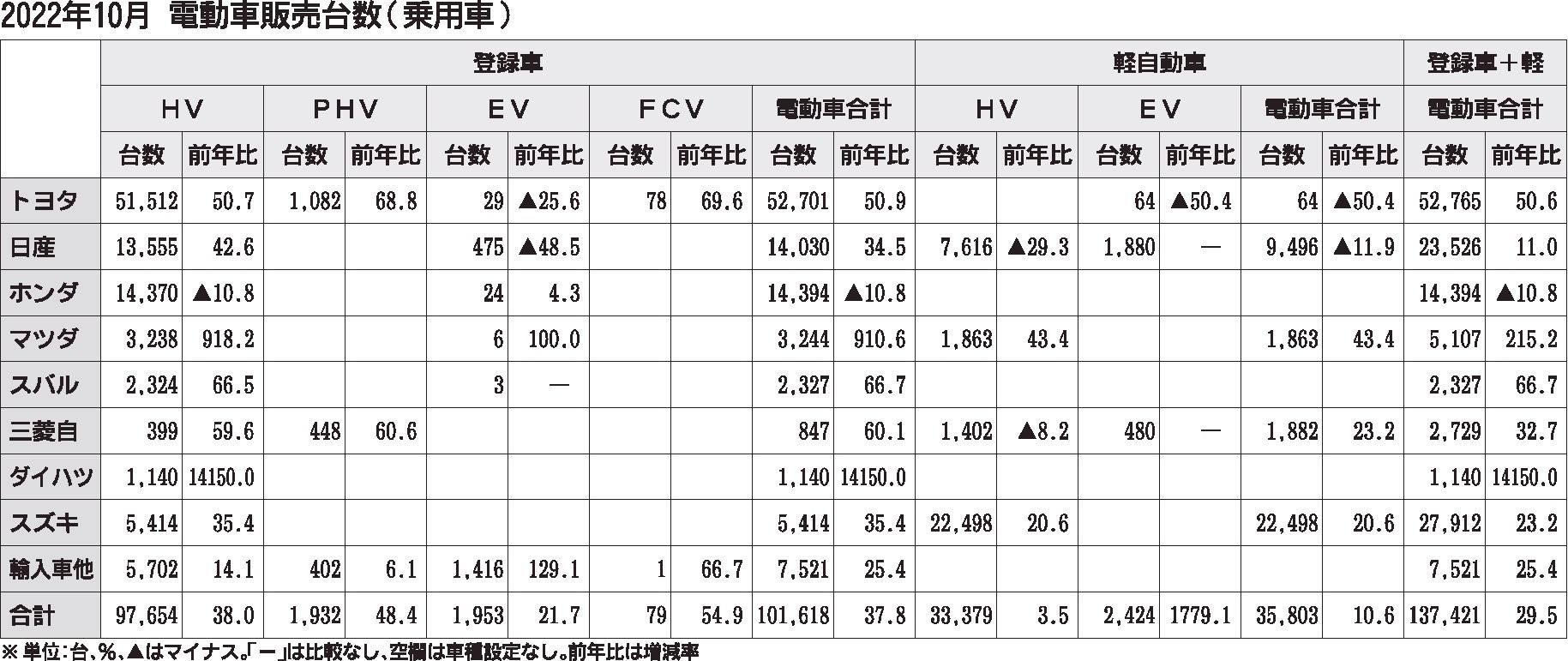 10月の電動車販売台数(乗用車、登録車・軽自動車合計)は、前年同月比29・5%増の13万7421台となり、2カ月連続で増加した。ハイブリッド車(HV)、電気自動車(EV)、プラグインハイブリッド車(PHV)、燃料電池車(FCV)のいずれも...
