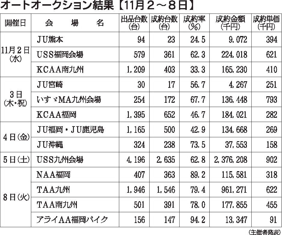 〈オートオークション結果〉九州・沖縄地区 2022/11/2~8