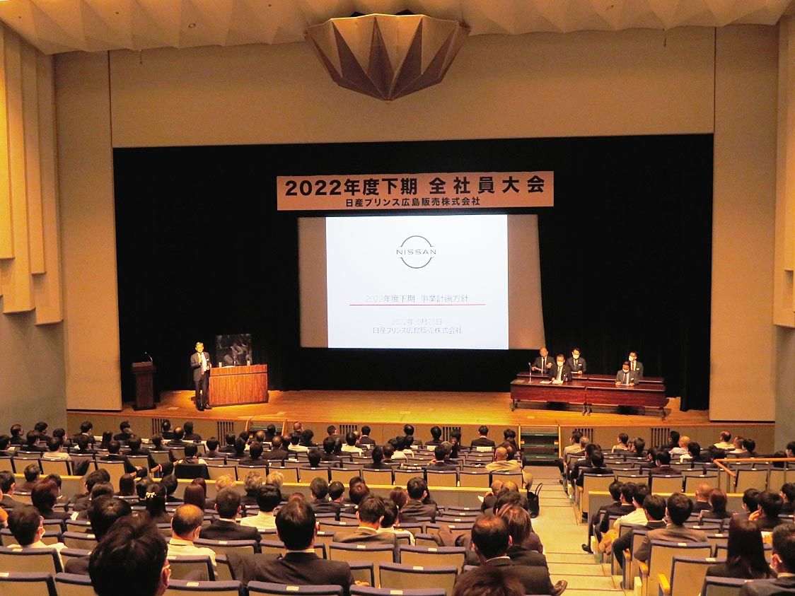日産プリンス広島(宮崎真澄社長)はこのほど、広島市南区民文化センターで「2022年度下期全社員大会」を開催し=写真、コロナ禍を脱しつつある中での方針を発表、約300人が出席した。新車の受注拡大とともに、中古車小売りやサービス入庫台数の拡大...