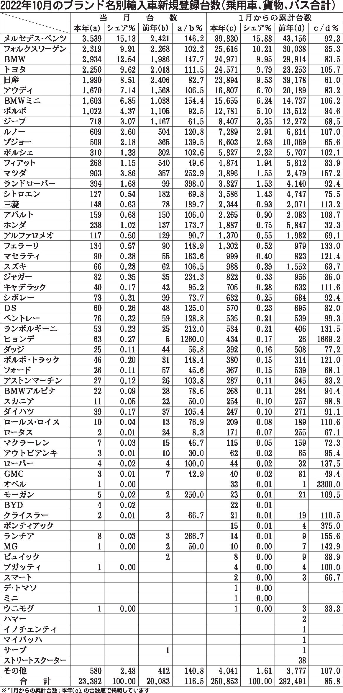 〈2022年10月のブランド名別輸入車新規登録台数(乗用車、貨物、バス合計)〉