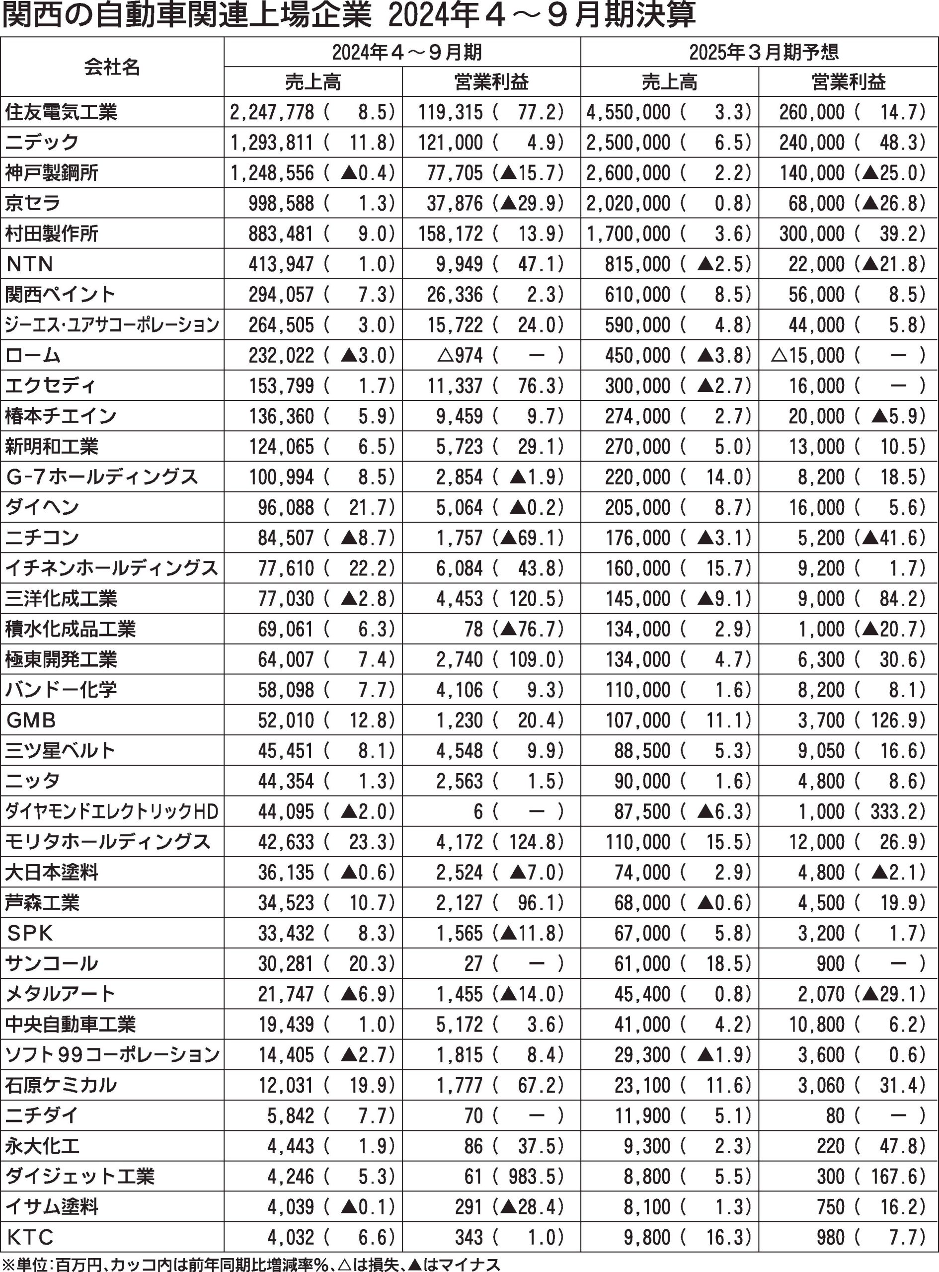 近畿2府4県に本拠を置く自動車関連上場企業の2024年4~9月期決算が出そろった。対象となる38社の内訳は、部品23社、塗料3社、架装3社、その他9社。このうち25社が増収・営業増益だった。部品メーカーを中心に、日本国内での認証不正問題や...