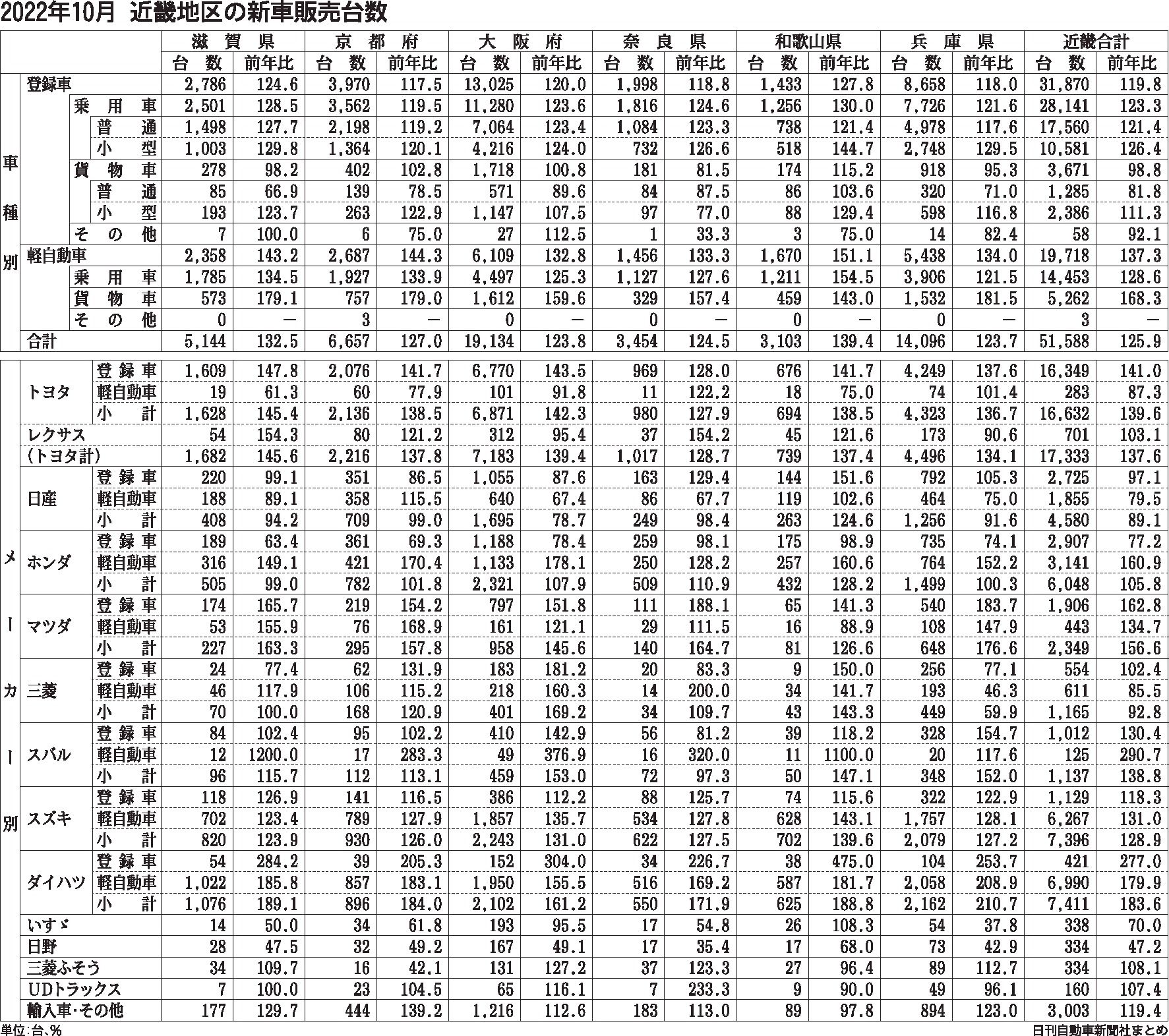 〈2022年10月 近畿地区の新車販売台数〉