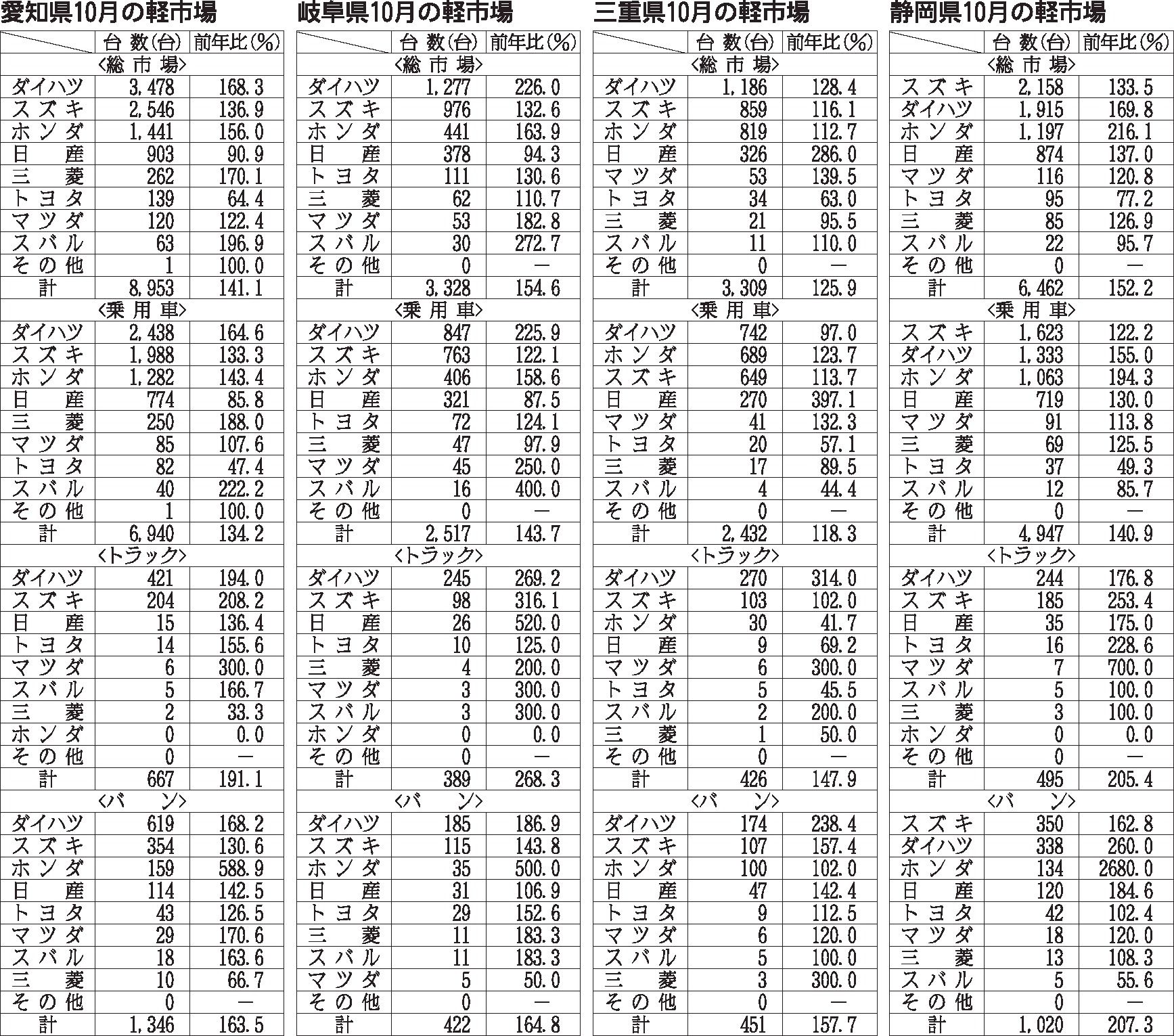〈中部4県10月の軽市場〉愛知県/岐阜県/三重県/静岡県