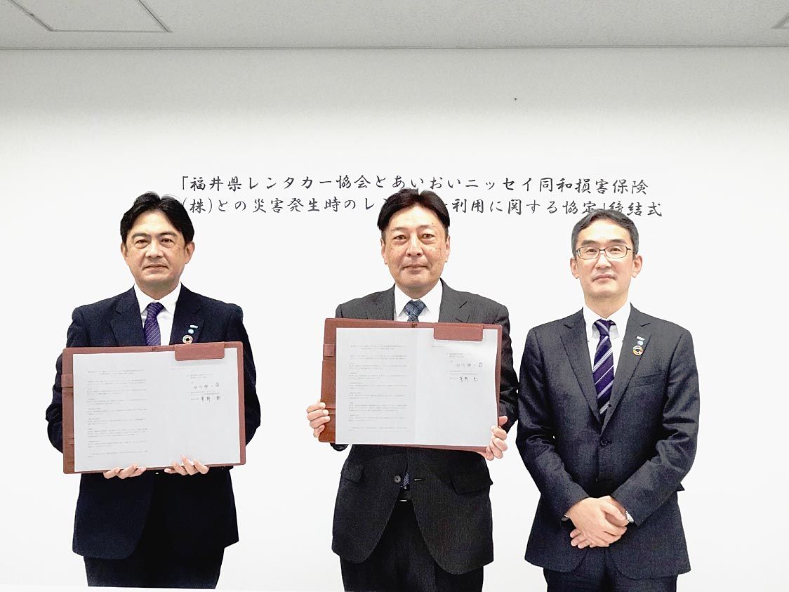 【福井】福井県レンタカー協会(中川伸一朗会長)は、あいおいニッセイ同和損害保険と自然災害発生時のレンタカー利用に関する協定を締結した。大規模災害発生後の保険金支払いの際、同社が被害状況調査に使用する車両を、協会の会員企業33社が保有するレ...