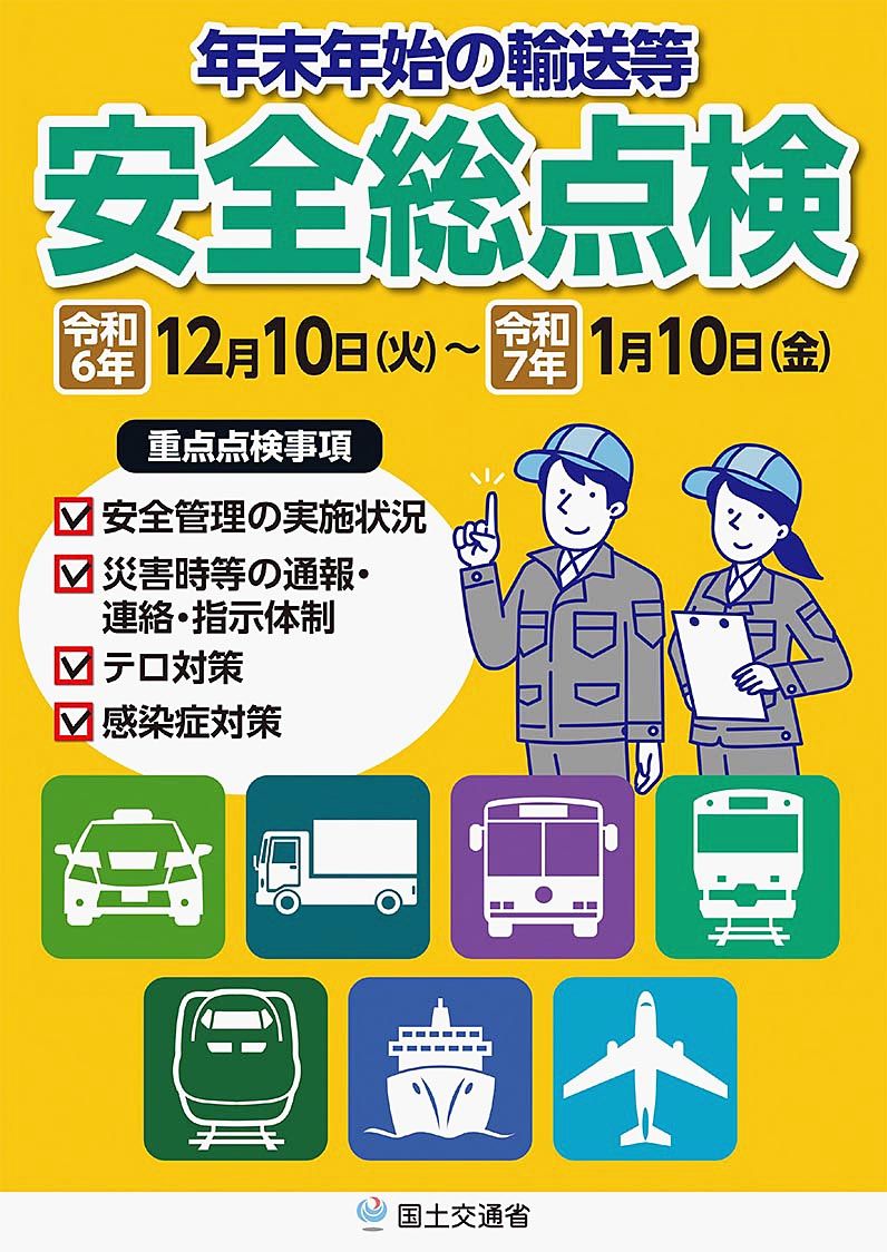 九州運輸局は、10日から「年末年始の輸送等 安全総点検」を実施する。年末年始の繁忙期に備え、各輸送機関の安全の確保に努める。 来月10日までの期間中、安全対策や関係法令等の遵守状況などをチェックする。重点点検項目は「安全管理の実施状況」「...