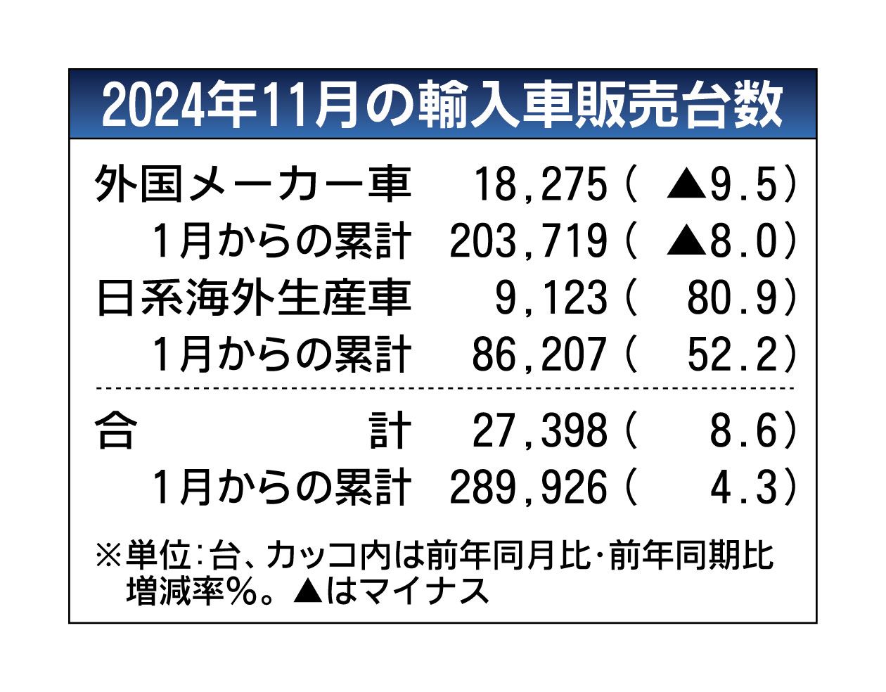 日本自動車輸入組合(JAIA、上野金太郎理事長)が5日発表した2024年11月の外国メーカー車新規登録台数は、前年同月比9.5%減の1万8275台となり11カ月連続で減少した。登録車全体に占める外国メーカー車の11月のシェアは7.3%で、前年同月に比べて0.6ポイント下がった。