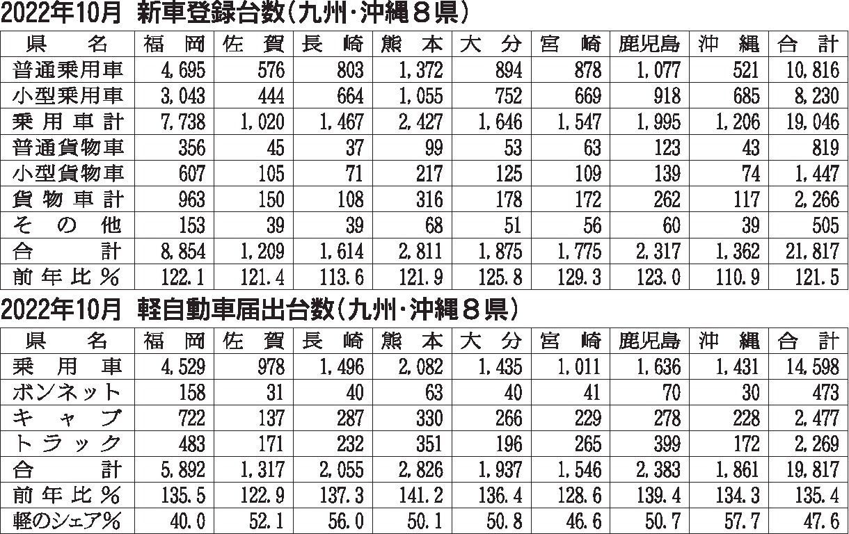 九州・沖縄地区の10月の新車販売台数(登録車と軽自動車合計)は、前年同月比27・8%増の4万1634台となり、2カ月連続で前年実績を上回った。登録車、軽自動車ともに前年超えし、全8県がそろって2割を超える大幅な増加となった。前年同月が3割...