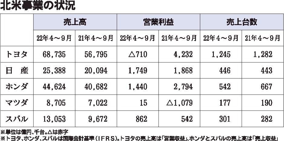 2022年4~9月期は、北米事業の収支が悪化したメーカーが続出した。半導体不足や人員不足の影響で生産の回復が鈍かったほか、原材料の高騰や半導体使用数の多い高級車の販売減、人件費の増加が収益を圧迫した。ホンダの竹内弘平副社長は「(これまでの...