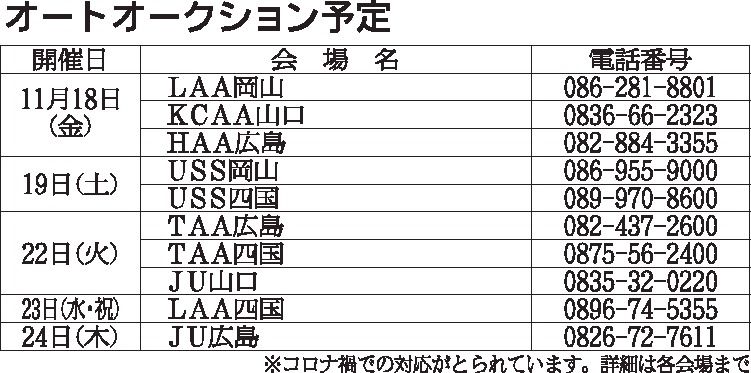 〈オートオークション予定〉中四国地区 2022/11/18~24
