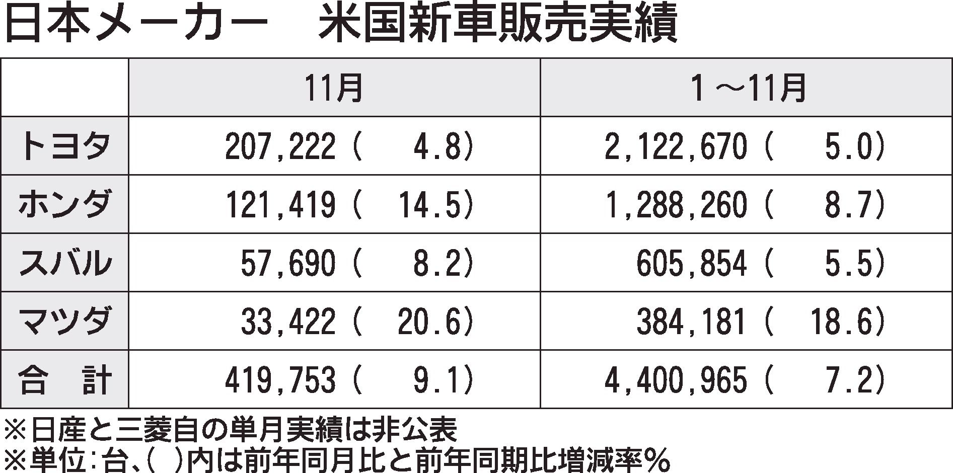 日本メーカー4社の2024年11月米国新車販売、9.1%増の41万9753台 2カ月連続プラス