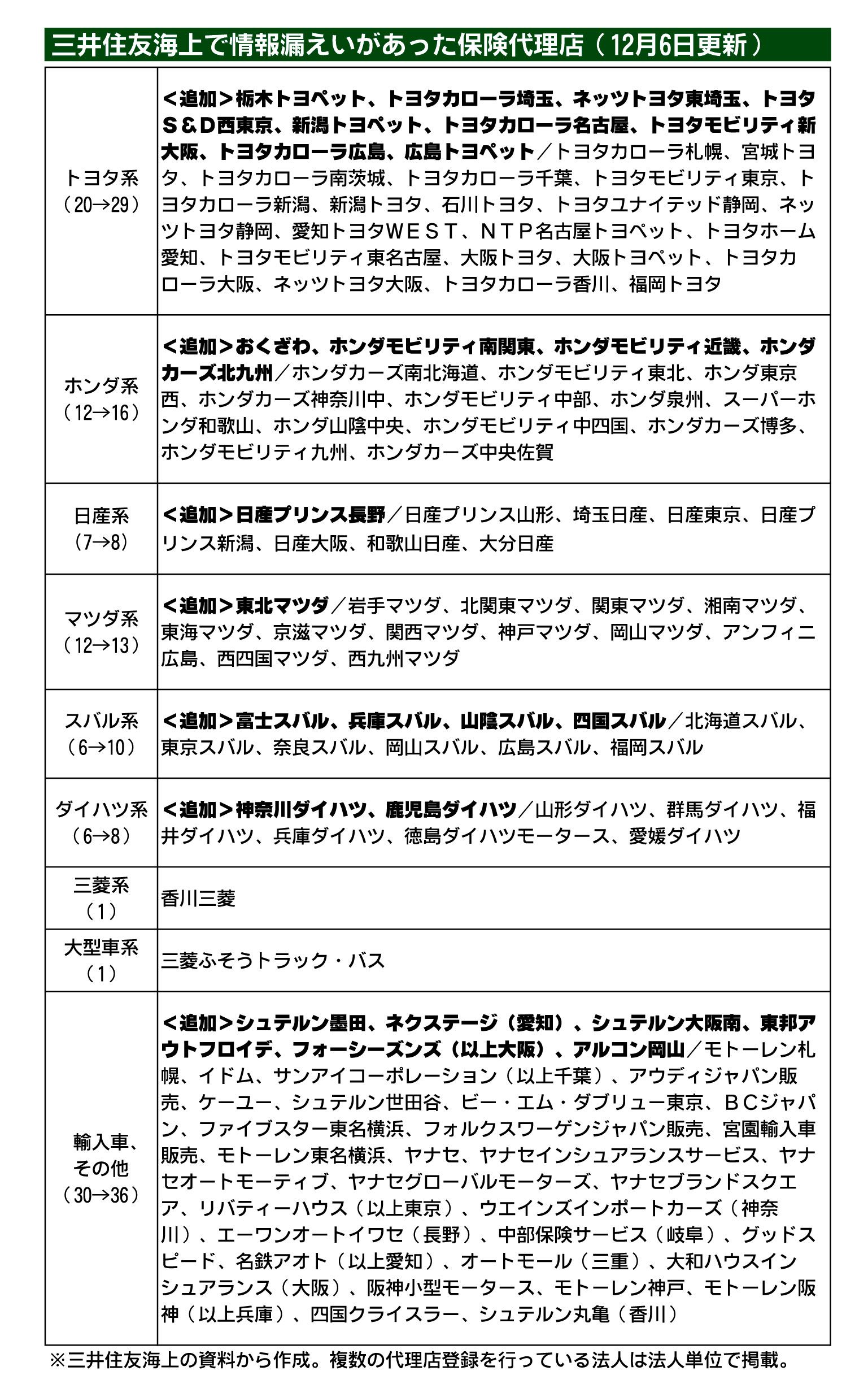 損害保険大手4社による一連の情報漏えい問題で、三井住友海上火災保険は12月6日、漏えいが判明した自動車ディーラーを含む保険代理店のうち、連絡先の分からない顧客がいる代理店が新たに27社確認されたと発表した。合計で122社になった。9月30日に初めて公表してから、3回目の更新となる。