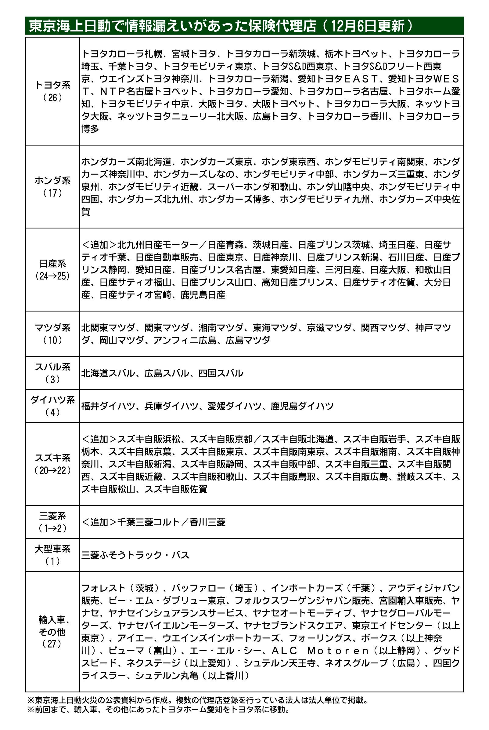 損害保険大手4社による一連の情報漏えい問題で、東京海上日動火災保険は12月6日、漏えいが判明した自動車ディーラーを含む保険代理店のうち、連絡先の分からない顧客がいる代理店が新たに4社確認されたと発表した。10月1日に初めて公表し、今回が9回目の更新で、計137社となった。
