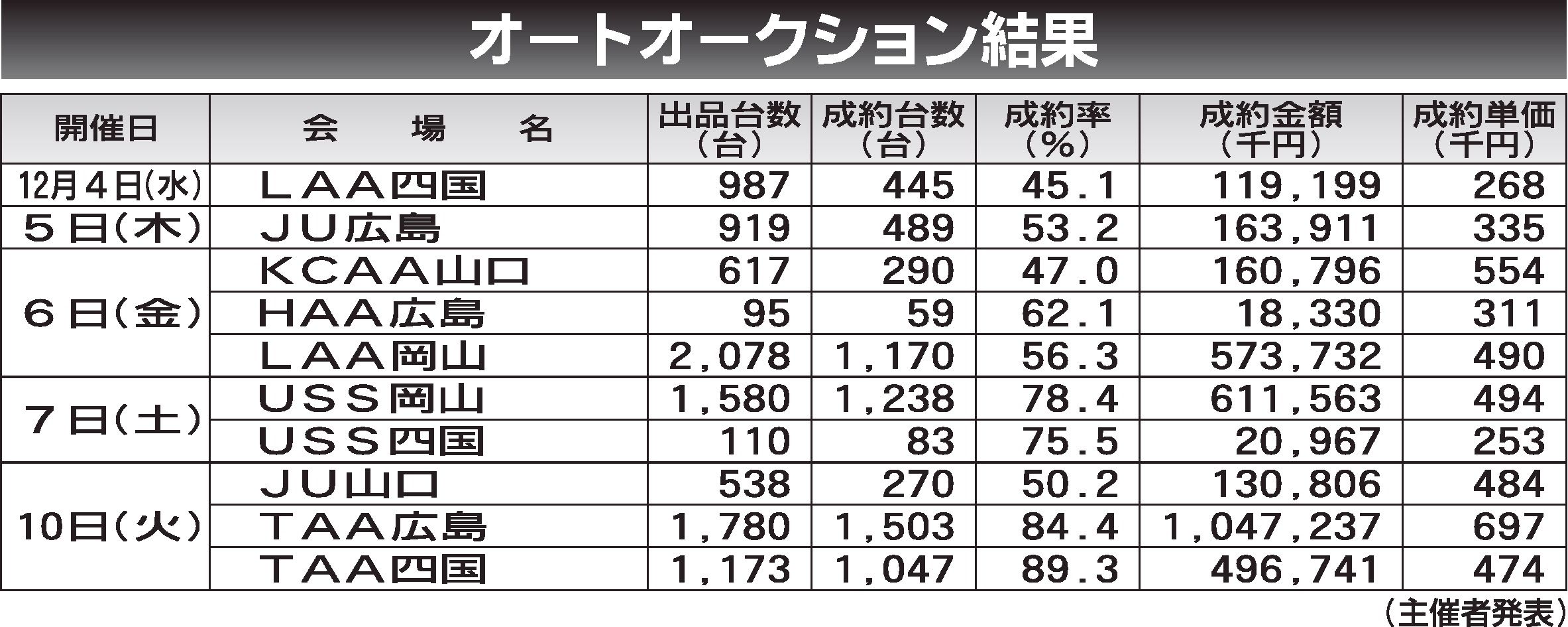 〈オートオークション結果〉中四国地区 2024/12/04~10