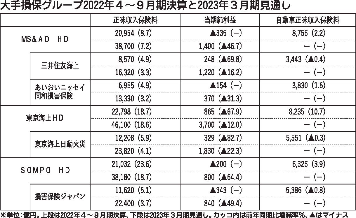 損害保険国内主要3グループが発表した2022年4~9月期連結決算は、いずれのグループも増収だった。国内外で正味収入保険料が増収となった一方、交通量の回復による自動車保険や台風やひょう害などの国内外の相次ぐ自然災害の保険金支払いにより、2グ...