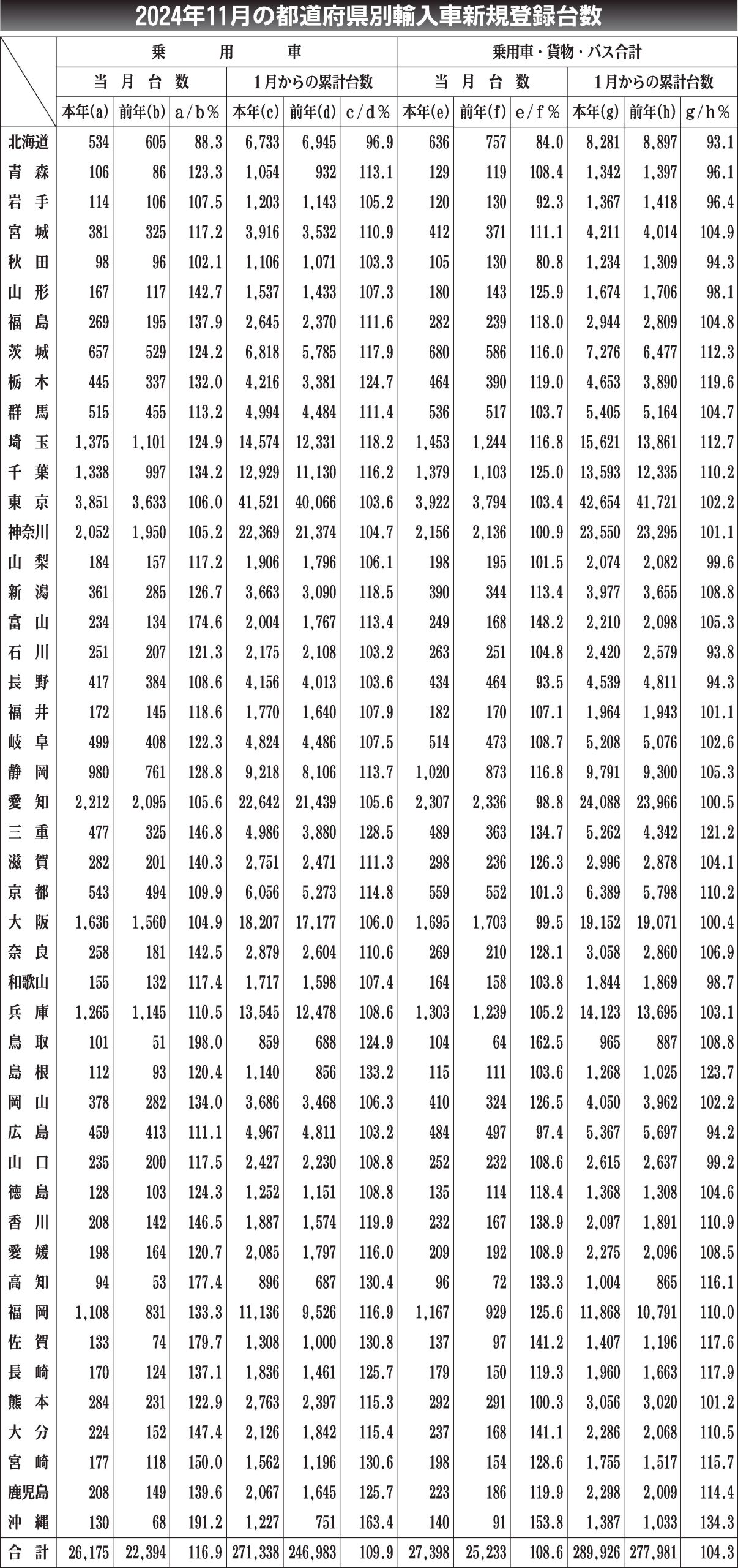 〈2024年11月の都道府県別輸入車新規登録台数〉