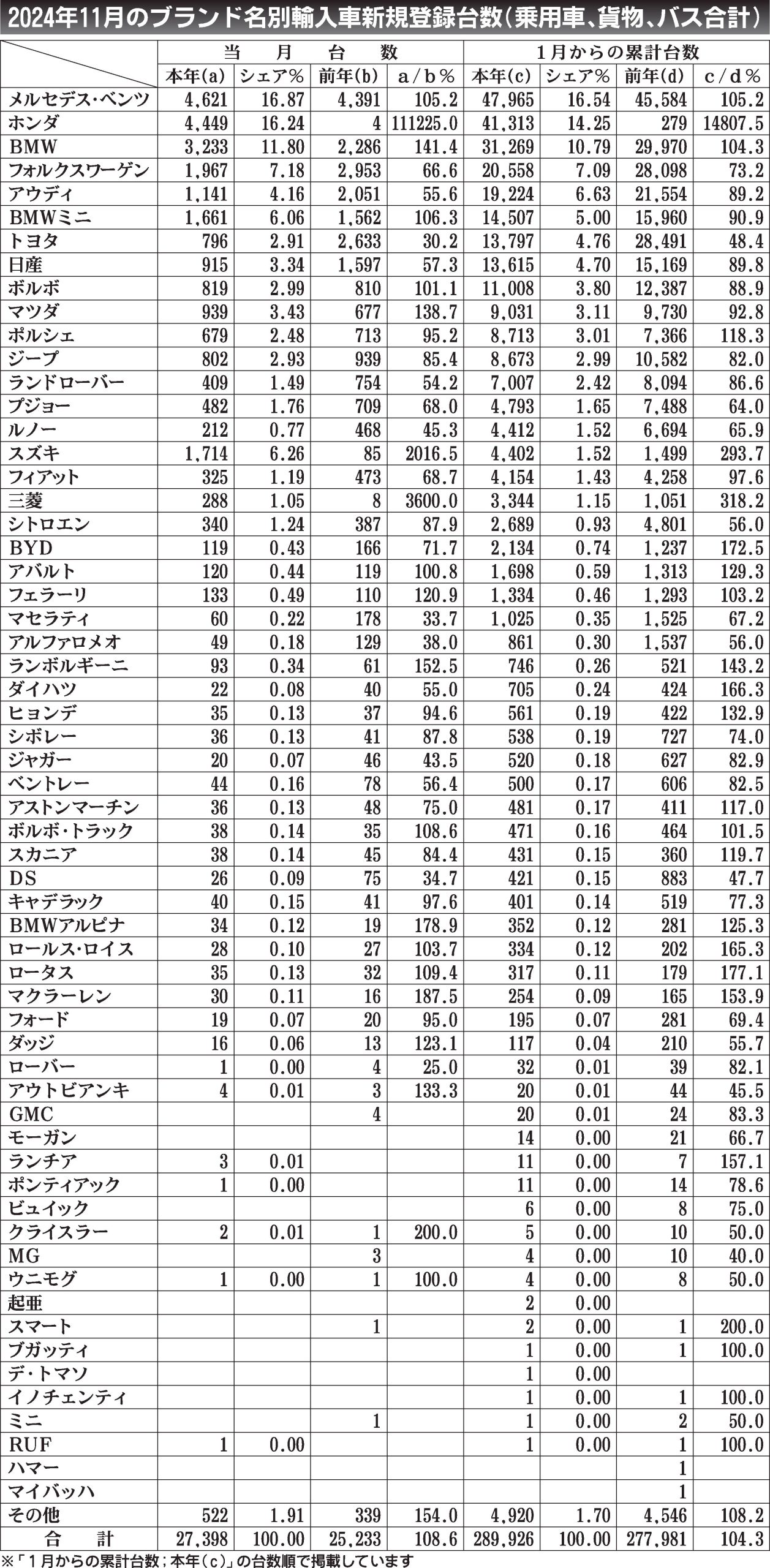 〈2024年11月のブランド名別輸入車新規登録台数(乗用車、貨物、バス合計)〉