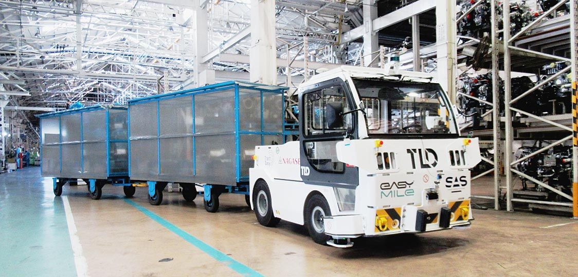 「未来の工場」目指し自律運転 三菱ふそうが無人自動けん引車によるエンジン運搬の実証実験を公開