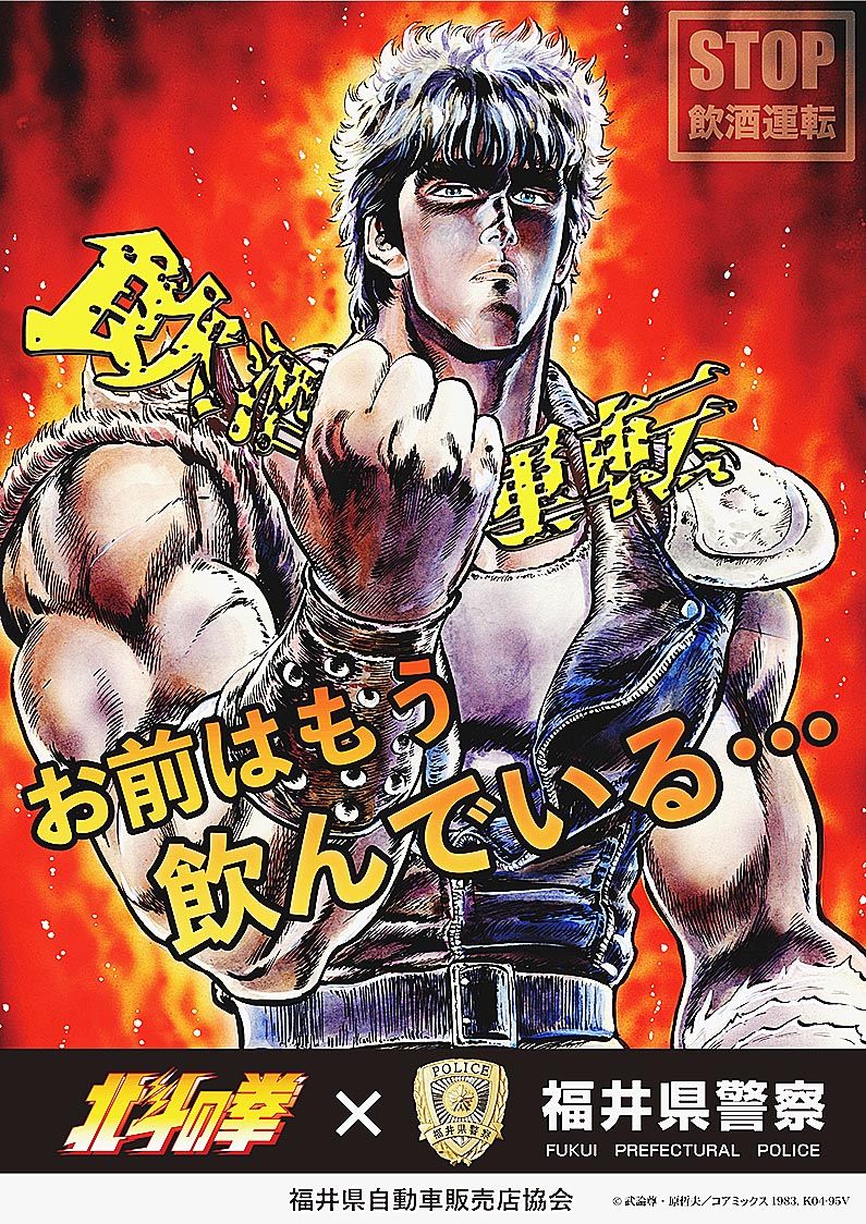 お前はもう飲んでいる。「飲酒運転」の文字を握りつぶしながらこう警告するのは、漫画「北斗の拳」の主人公、ケンシロウだ。福井県自動車販売店協会(浮田啓三会長)と福井県トラック協会(清水則明会長)が飲酒運転根絶に向けて製作したポスターで、このほ...