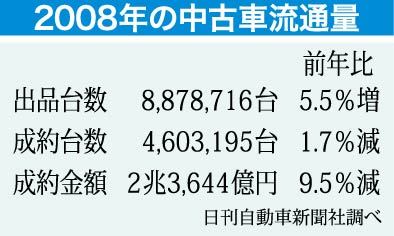 2008年の中古車オークション(AA)流通量は、出品台数が887万8716台と、前年比で5・5%増えたことが日刊自動車新聞の調査で分かった。成約台数は460万3195台(前年比1・7%減)と減少し、中古車市場の購買力を示す平均成約率も51...