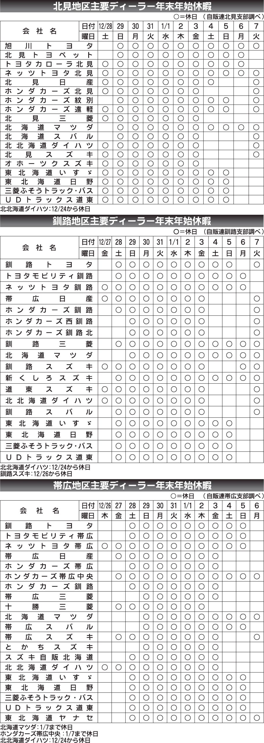 〈主要ディーラー年末年始休暇〉北見地区/釧路地区/帯広地区(2024/12/26~2025/1/7)