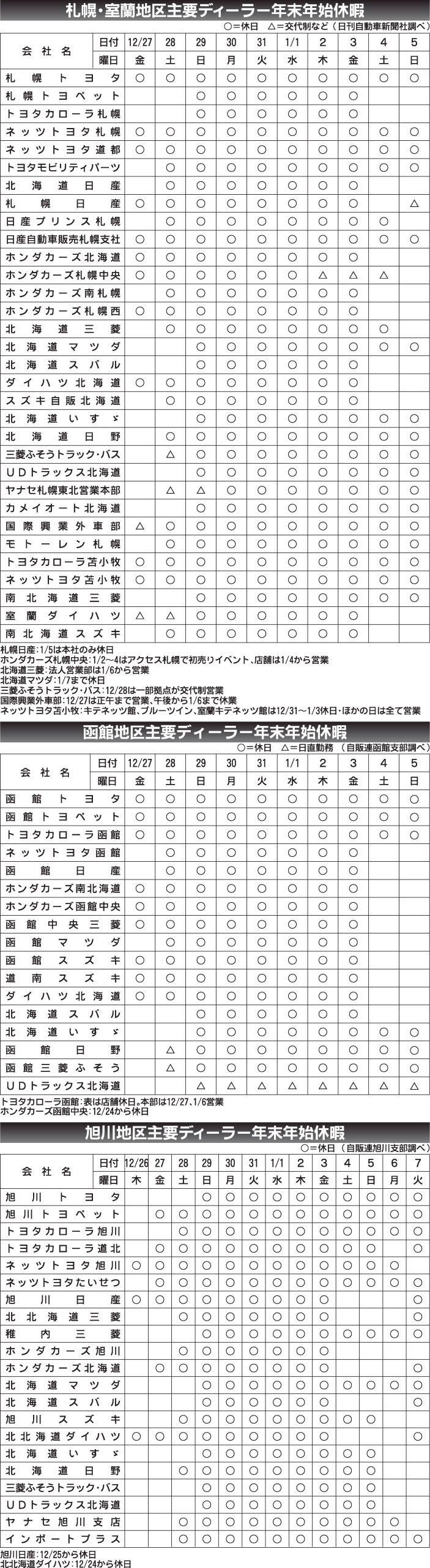 〈主要ディーラー年末年始休暇〉札幌・室蘭地区/函館地区/旭川地区(2024/12/26~2025/1/7)
