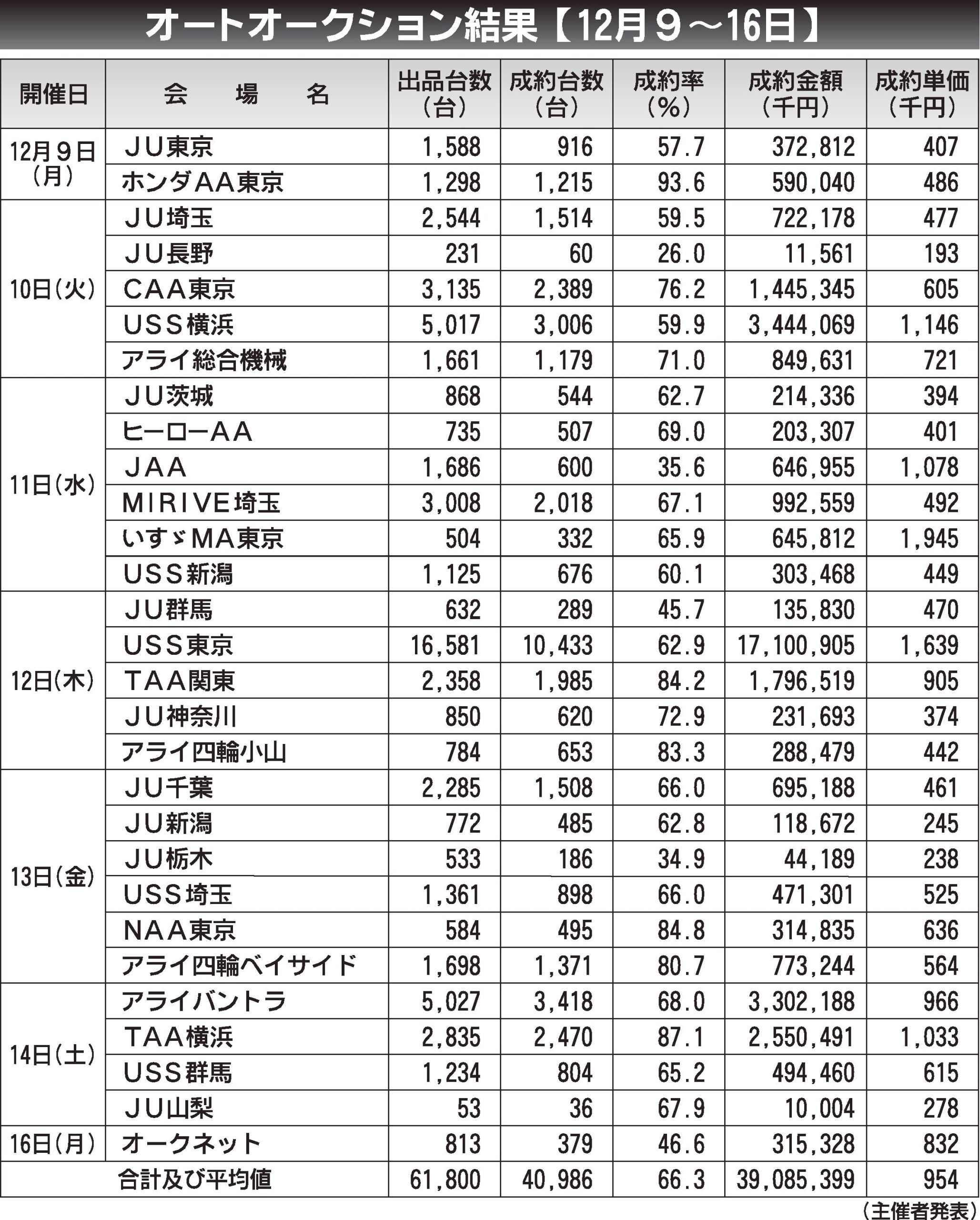 〈オートオークション結果〉首都圏 2024/12/9~16