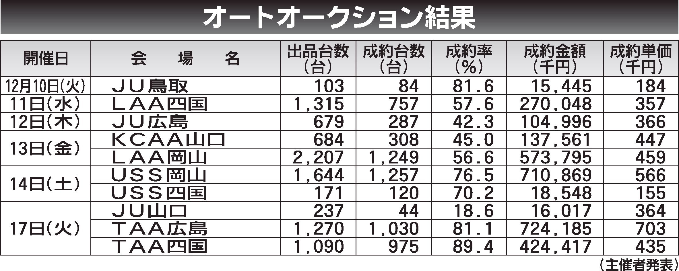 〈オートオークション結果〉中四国地区 2024/12/10~17