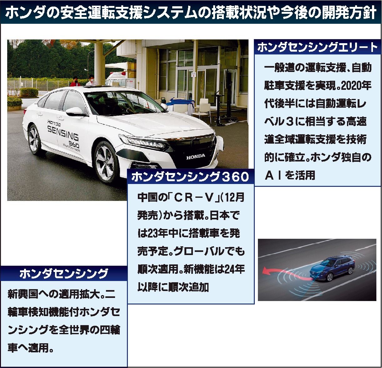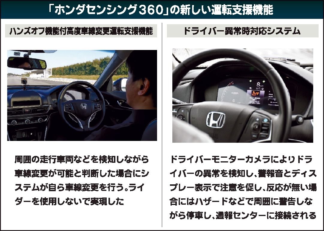 ホンダは、次世代の安全運転支援技術を公開した。車両周囲を検知して事故を減らす「ホンダセンシング360」では、ドライバー異常時対応システムなどを開発し、2024年以降に車両へ搭載する。自動運転「レベル3」(条件付き自動運転)に相当する「ホン...