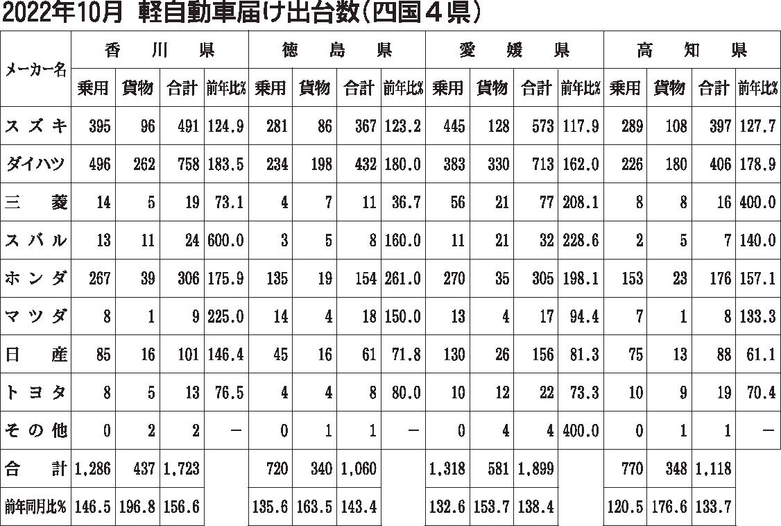四国地区2022年10月の新車販売台数(含軽自動車)は、新車生産の回復基調を反映して、前年同月比32・4%増の1万1486台となり、2カ月連続で増加した。昨年比では大幅増となったが、一昨年の20年との比較では12・7%減となり、実際の生産...