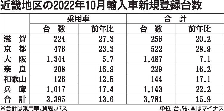 日本自動車輸入組合(JAIA)の発表によると、2022年10月の近畿地区の輸入車新規登録台数(外国メーカー車+日本メーカー車)は、前年同月比15・9%増の3781台となり、14カ月ぶりに前年台数を上回った。内訳は乗用車が同13・6%増の3...