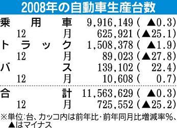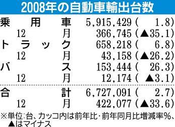 日本自動車工業会(自工会)が1月30日発表した2008年12月の国内自動車生産・輸出実績は、国内外の販売不振に対応する減産の強化により前年比25・2%減の72万5552台となり1966年の統計開始以来、全期間を通じて過去最大の下落率になっ...