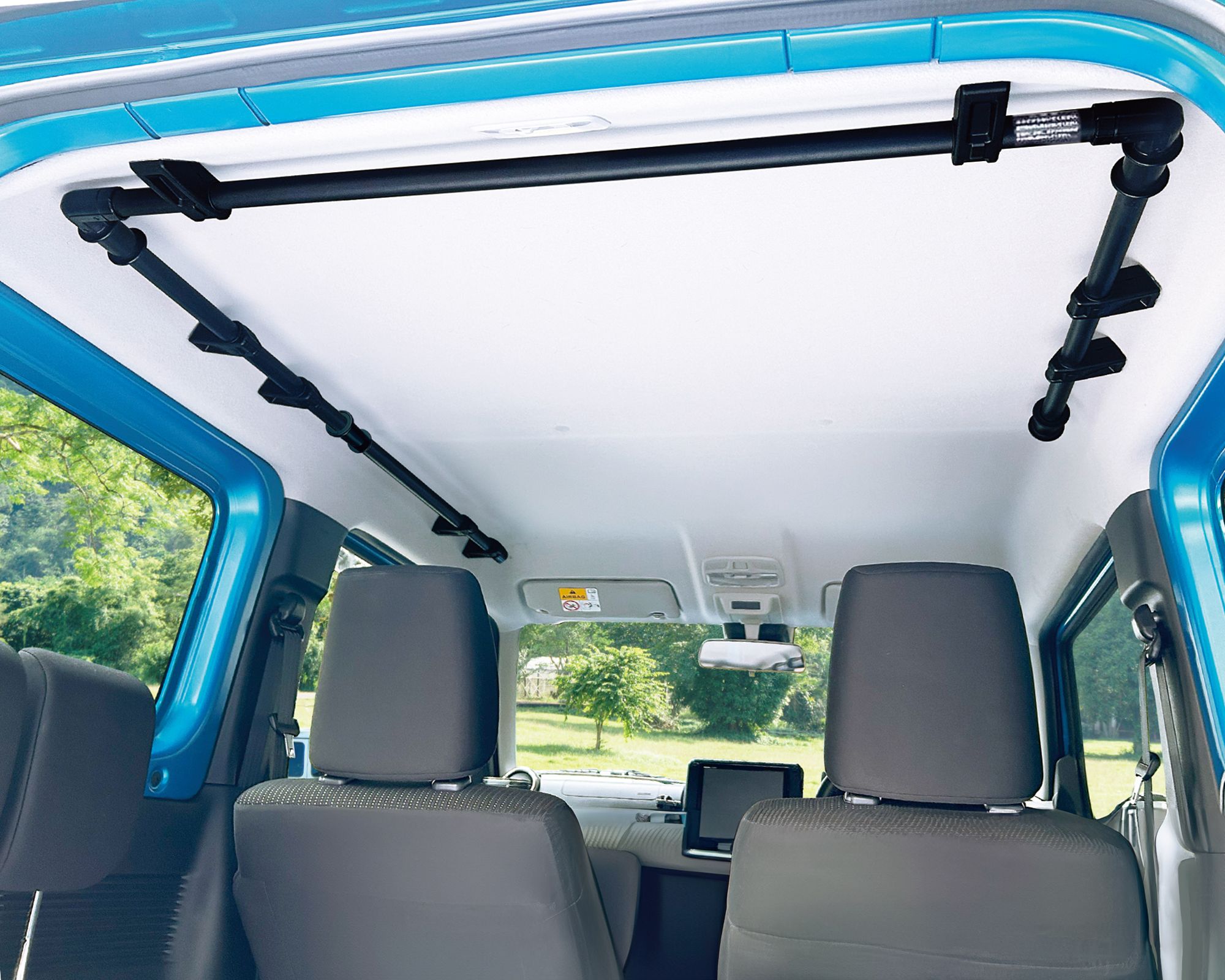 ジムニー専用品の「イルミコンソールトレイ」は、デッドスペースになりがちなセンターコンソールのすき間に設置する増設収納トレイ。収納だけでなく、ドリンクホルダーや充電用のポートも装備。夜間は暗くて見えないセンターコンソール周辺も間接照明付きで見やすくした。「ロングサイドバー」は、ラゲッジスペースの天井空間を有効活用し、収納力をアップするコの字型増設サイドバー。アシストグリップのねじ穴を利用し、加工なしで取り付けが可能だ。粉体塗装仕上げのブラックバーが車室内を武骨に演出する。「ドリンクホルダートレイ」は、ナビモニター下のセンターパネルに取付ける増設収納トレイ。ドリンクホルダーも装備しており、使い勝手の良さがポイントだ。