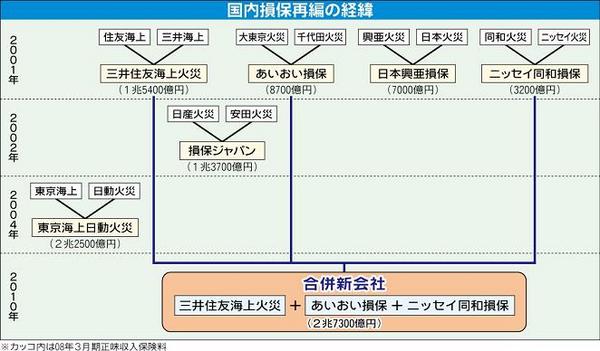 三井住友海上グループホールディングス(HD)および三井住友海上火災、あいおい損害保険、ニッセイ同和損害保険は23日、経営統合に向けた正式協議を進めると発表した。統合時期は2010年4月。合併新会社の正味収入保険料は約2兆7300億円となり...