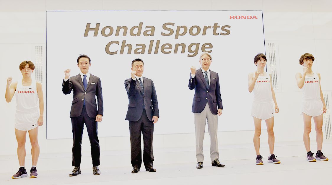 ホンダは5日、企業スポーツの活動方針に関する記者発表会を開いた。三部敏宏社長=右から3人目=は「ホンダのDNAである『チャレンジ』をコアにスポーツを通じて皆さまに感動や喜びをお届けしたい」と語った。 スローガンに「ホンダスポーツチャレンジ...