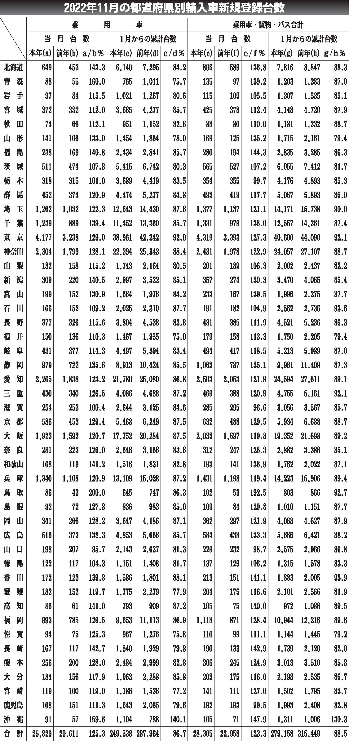 〈2022年11月の都道府県別輸入車新規登録台数〉