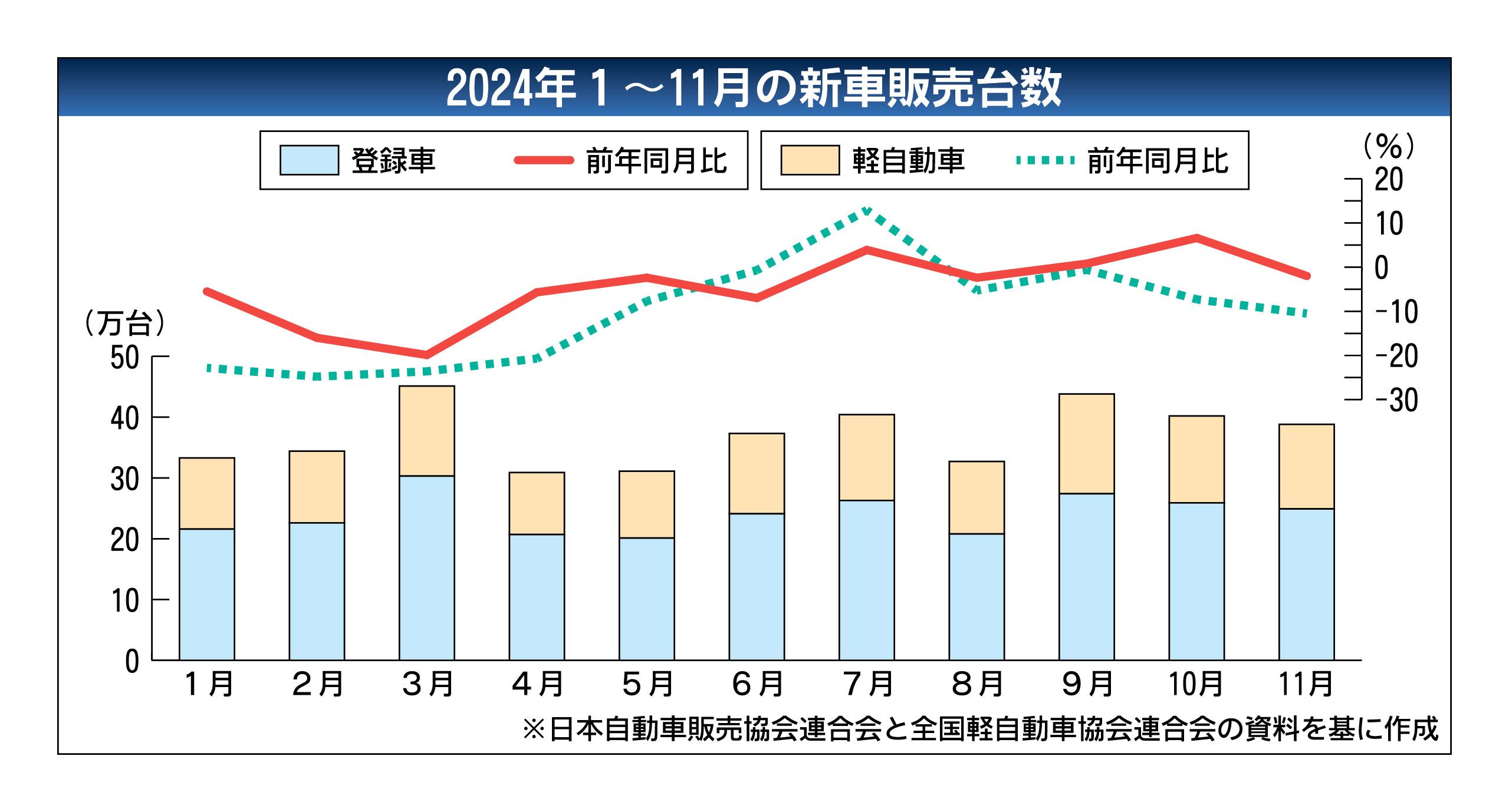 2024年の新車市場は、一部の自動車メーカーによる認証不正問題の拡大が影を落とした。日本自動車販売協会連合会(自販連、加藤敏彦会長)と全国軽自動車協会連合会(全軽自協、赤間俊一会長)によると、1~11月の累計販売台数は、前年同期比7.3%...