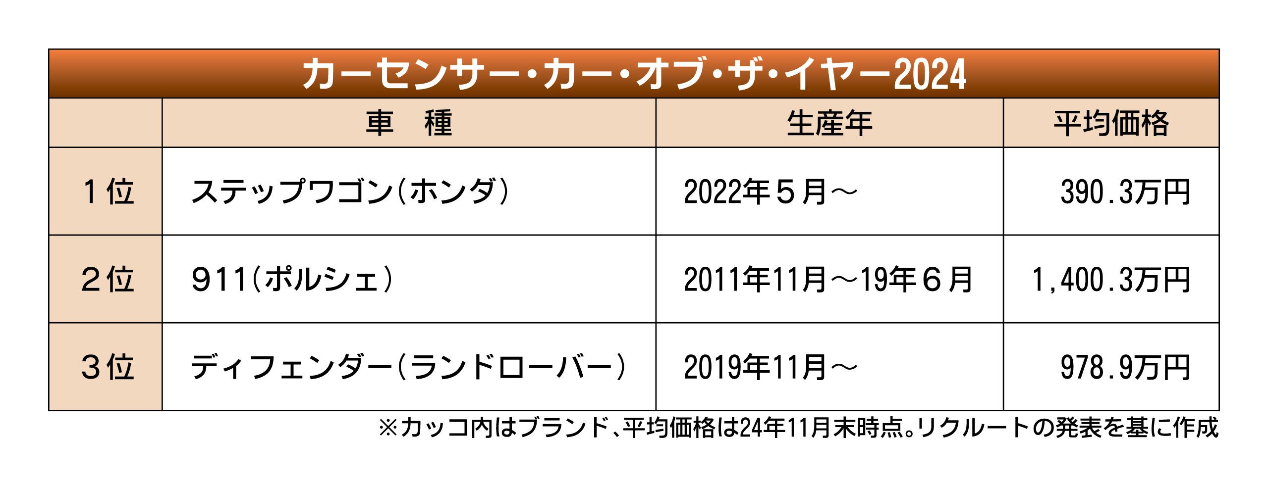 リクルート(北村吉弘社長、東京都千代田区)は、同社が運営している中古車情報サイトで注目を集めた「カーセンサー・カー・オブ・ザ・イヤー2024」を発表した。1位はホンダのミニバン「ステップワゴン」(22年発売モデル)で、全面改良から2年がた...
