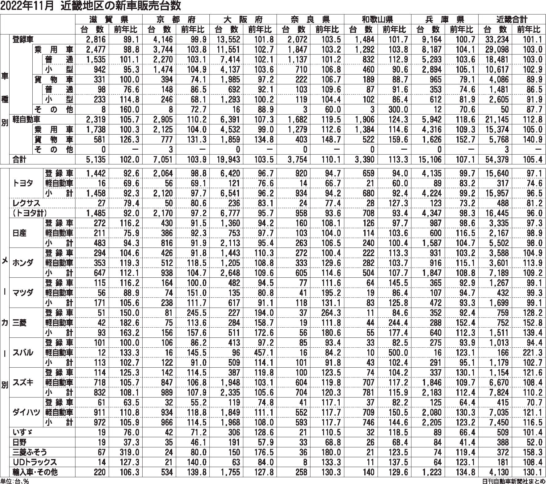 近畿2府4県の11月の新車販売台数(登録車+軽自動車)は、前年同月比5・4%増の5万4379台だった。3カ月連続で前年を上回ったものの、伸び幅は前月(25・9%増)から20㌽以上鈍化した。奈良県と和歌山県は2桁増を維持したものの、大阪府、...