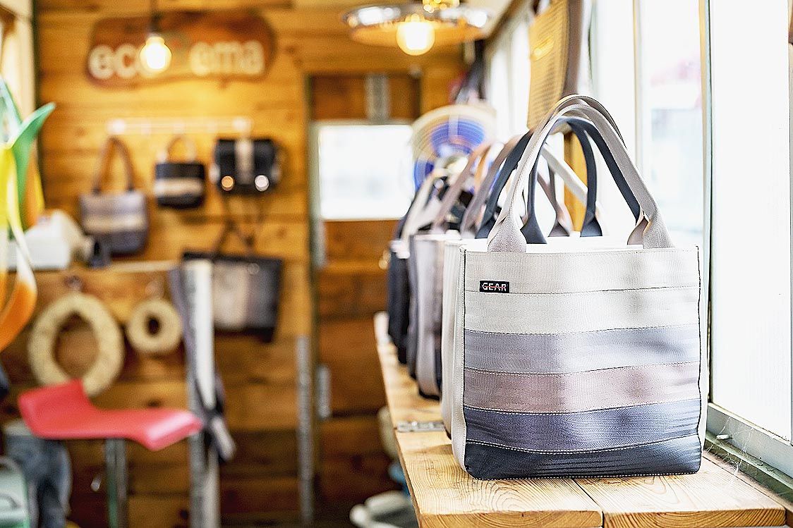 自動車リサイクルのギヤ、使用済みシートベルト活用 トートバッグ制作