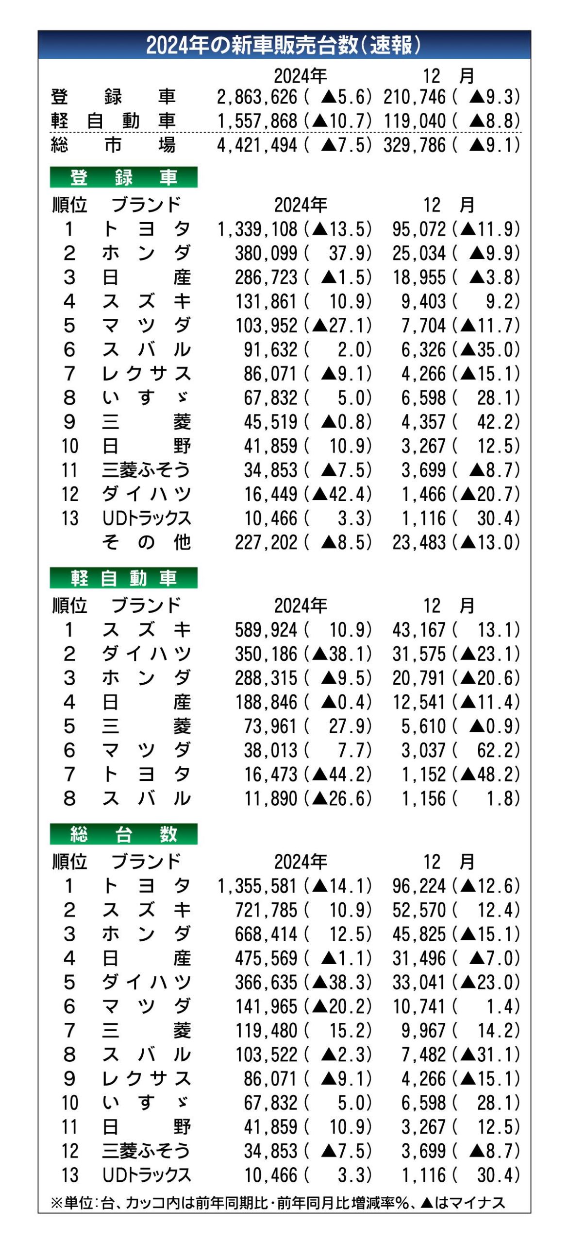 2024年の国内新車販売、前年比7.5%減 2年ぶり前年割れ 認証不正の影響大きく
