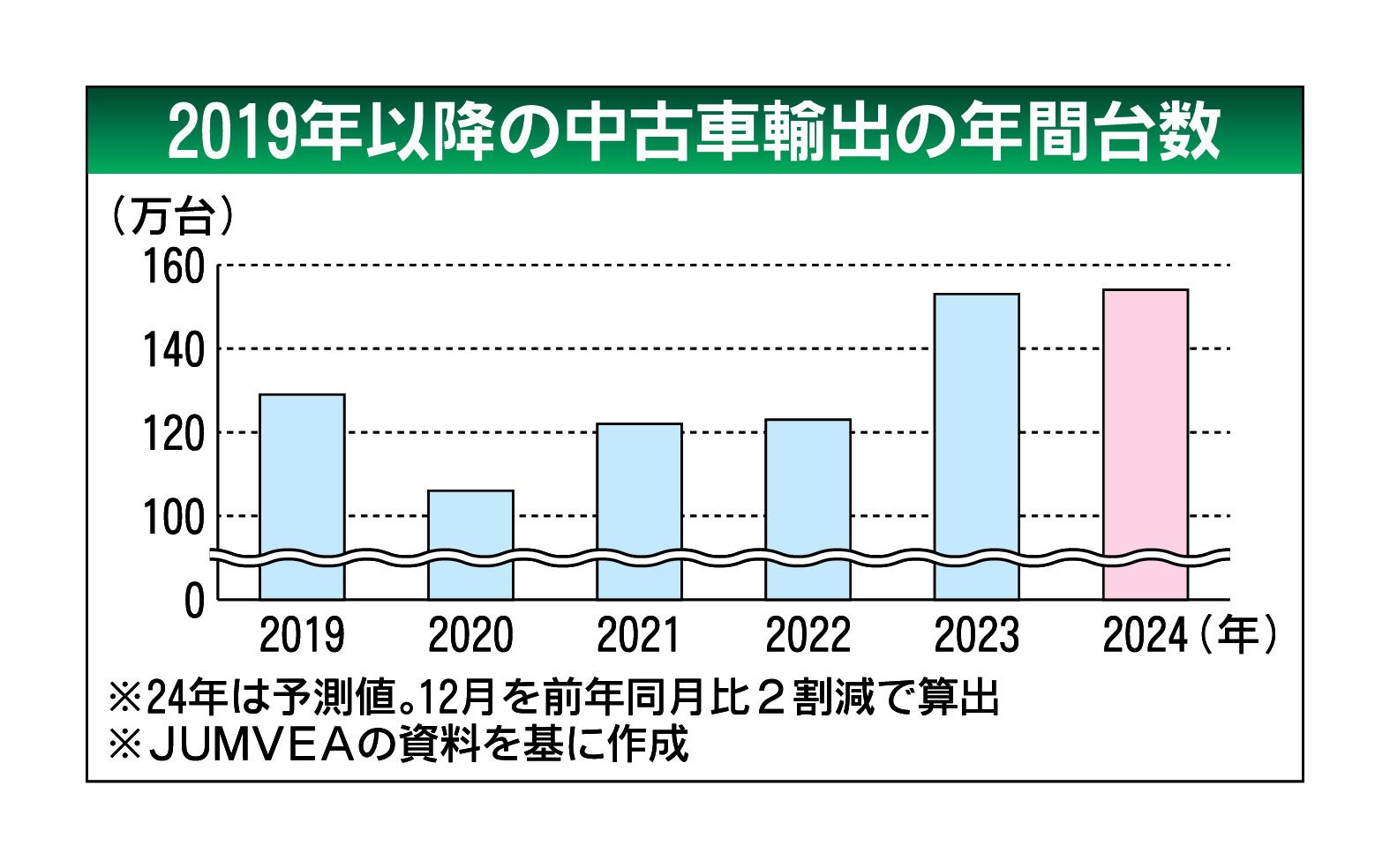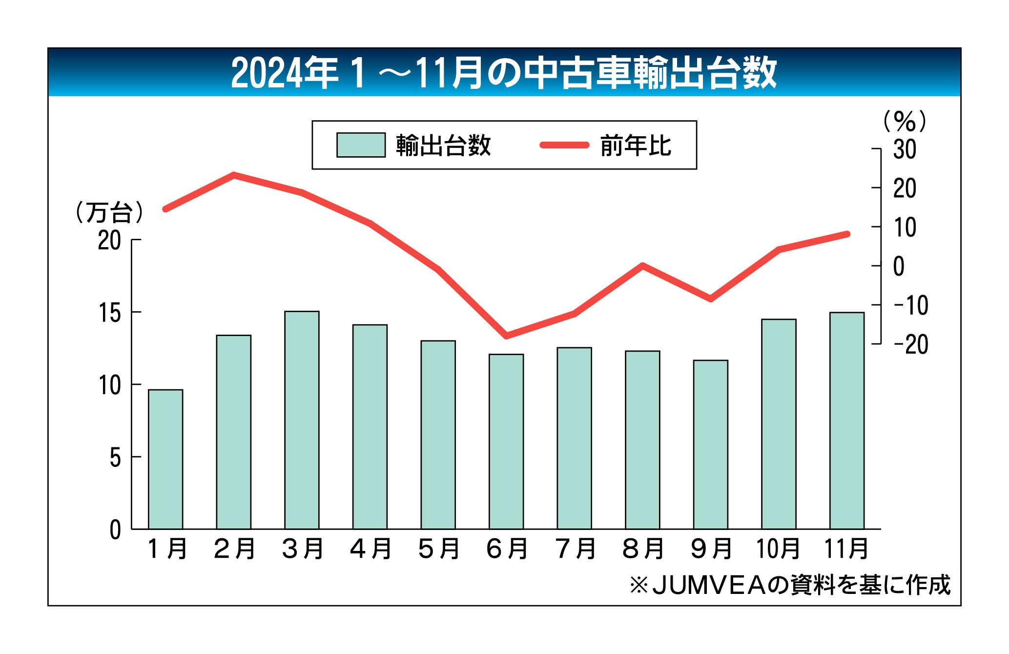 2024年の中古車輸出台数(車両価格20万円以上)が、2年連続で過去最高を更新する可能性が高まった。プラスならば4年連続。日本中古車輸出業協同組合(JUMVEA、佐藤博理事長)がまとめた同年1~11月の累計輸出台数は、前年同期比2.5%増...