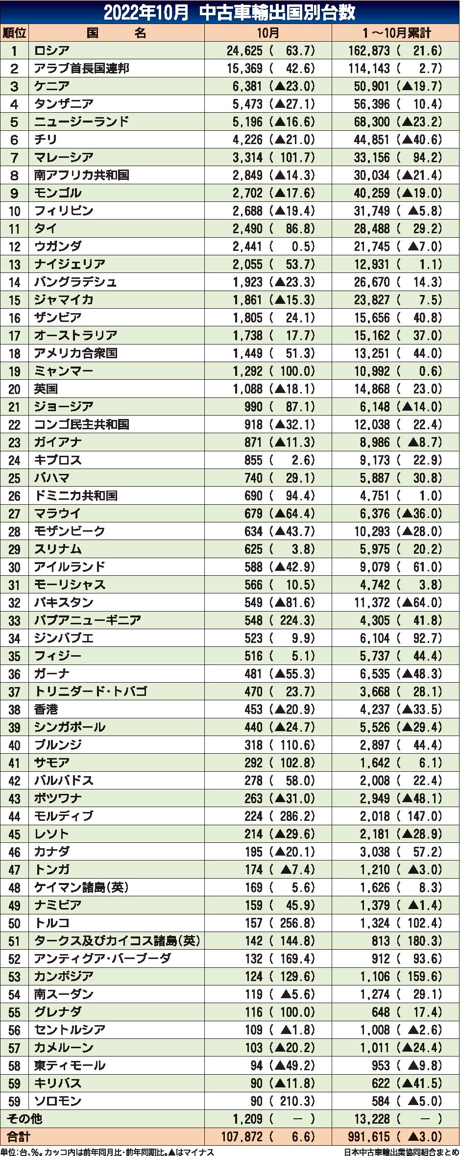 日本中古車輸出業協同組合(JUMVEA、佐藤博理事長)がまとめた2022年10月の中古車輸出台数(車両価格20万円以上)は、前年同月比6・6%増の10万7872台で4カ月ぶりに増加に転じた。10万台超えは3カ月ぶり。仕向け地別では、日本や...