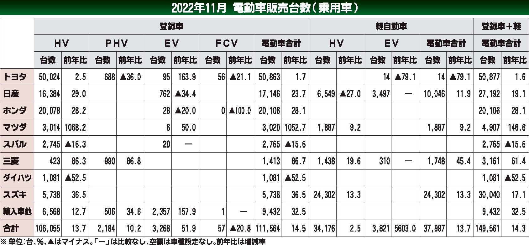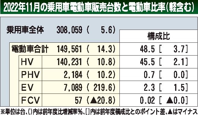 11月の電動車販売台数(乗用車、登録車と軽自動車の合計)は、前年同月比14・3%増の14万9561台となり、3カ月連続で増加した。乗用車販売に占める電動車比率は3・7㌽増の48・5%と5割に迫る。ハイブリッド車(HV)が好調なほか「クリー...