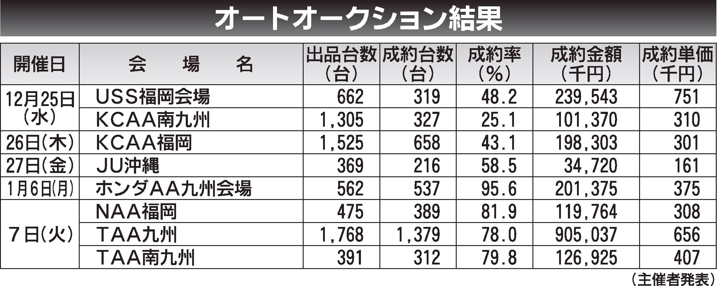 〈オートオークション結果〉九州地区 2024/12/25~1/7