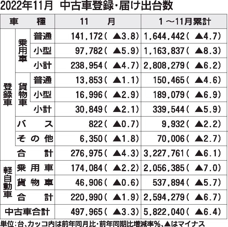 日本自動車販売協会連合会(自販連、金子直幹会長)と全国軽自動車協会連合会(全軽自協、赤間俊一会長)が12日に発表した11月の中古車登録・届け出台数は、前年同月比3・3%減の49万7965台で18カ月連続のマイナスとなった。減少幅は前月に比...