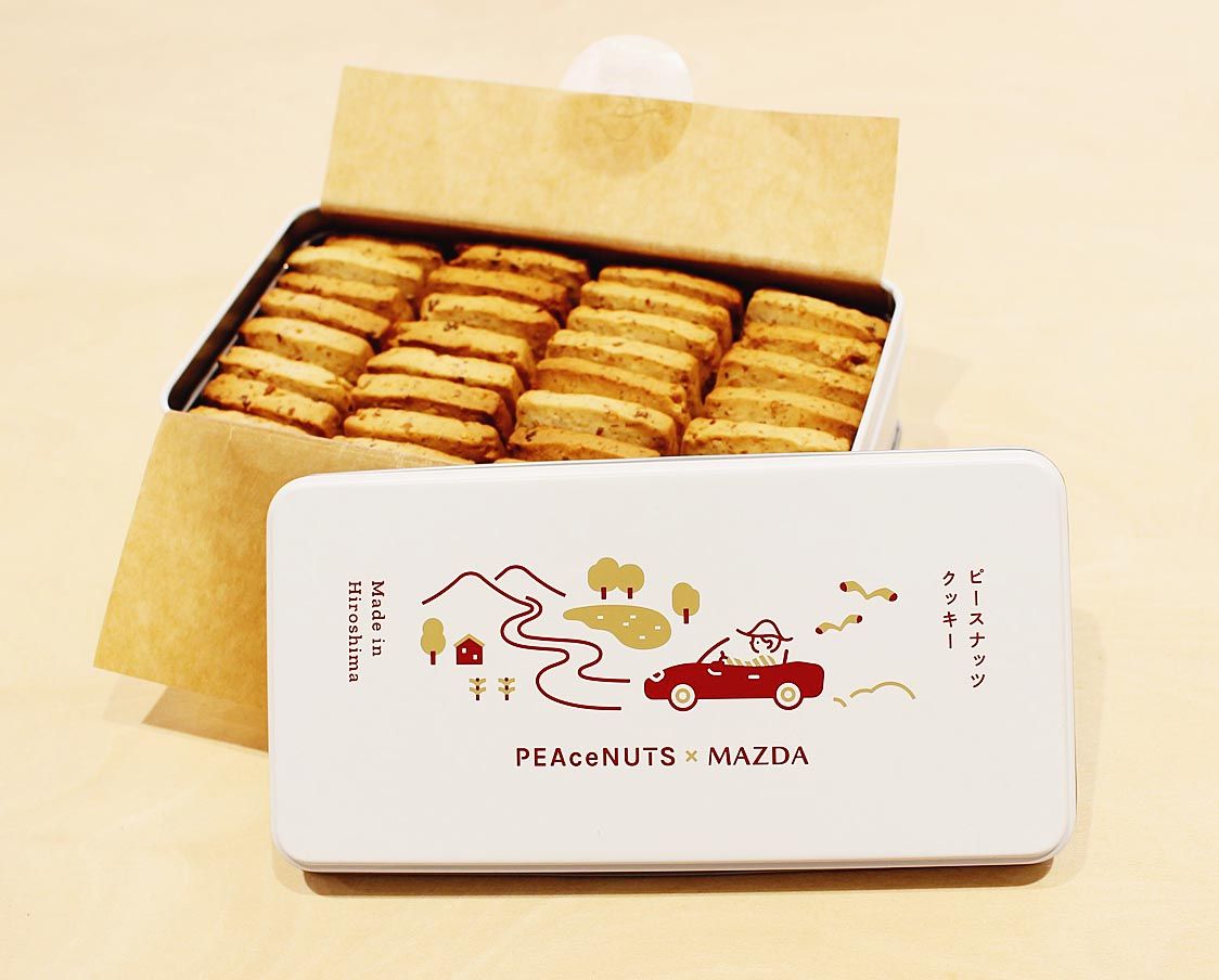 マツダは、広島県の地元企業と協業し、地域の魅力を伝える商品を売り出す。第1弾として、ピースナッツカフェ(広島県呉市)とコラボレーションし「ピースナッツクッキー」を発売した。ピースナッツカフェのイメージキャラクター「Seraちゃん」が「ロードスター」でドライブする様子を描いた特別缶を制作した。ピースナッツカフェのオンラインショップのほか、マツダミュージアムでも扱う予定だ。