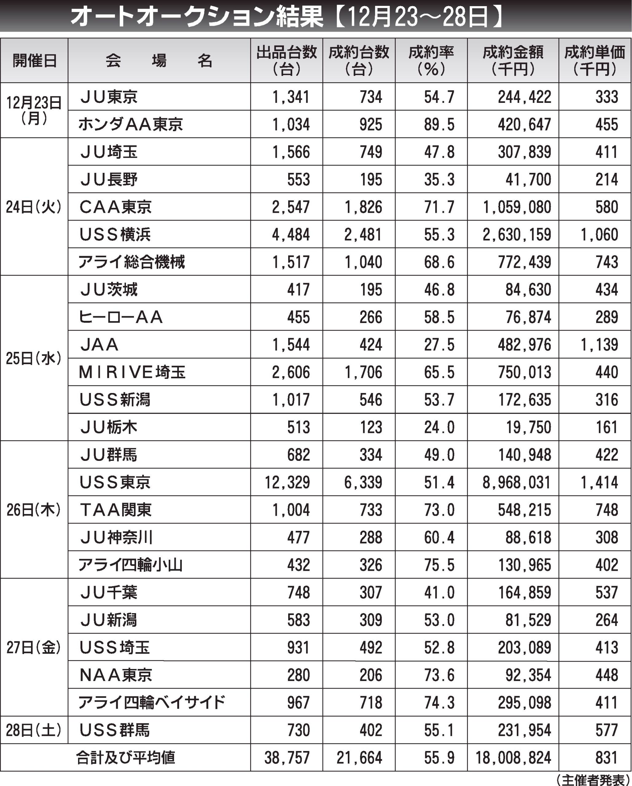〈オートオークション結果〉首都圏 2024/12/23~28