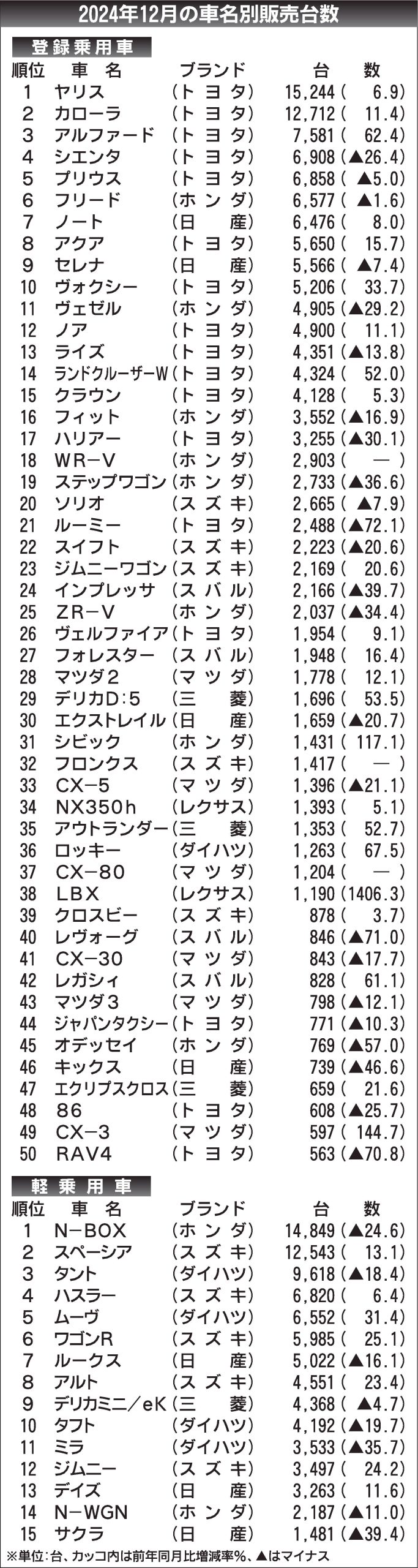 〈2024年12月の車名別販売台数〉