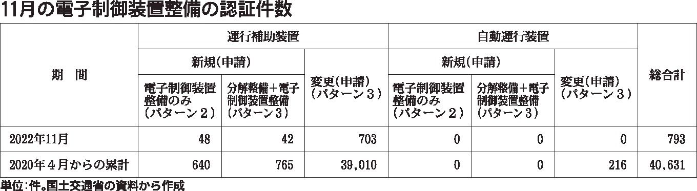国土交通省がまとめた11月の電子制御装置整備の認証件数は793件だった。地方運輸局別認証件数の上位3局は関東の270件、北陸信越の128件、中部の93件の順だった。特定整備制度が施行した2020年4月からの累計認証件数は、4万631件(う...